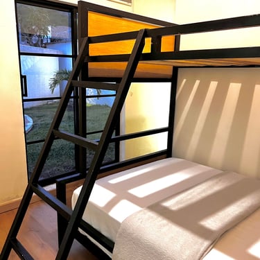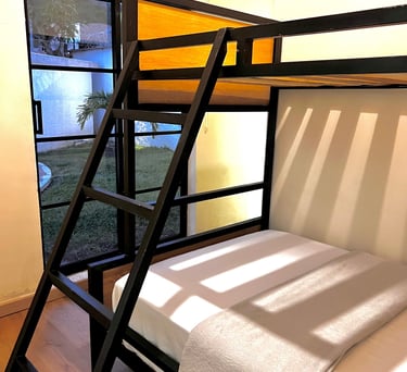 Este acogedor espacio cuenta con vistas a la piscina, un diseño industrial con cama "queen", camarote doble, baño y cocina